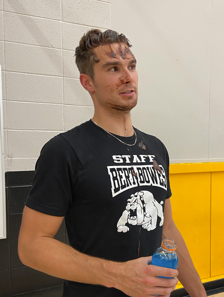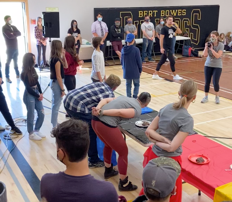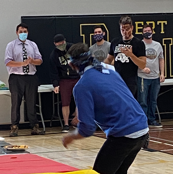 “Spirit Friday!” welcomed students to a new school year. Leadership students ran the event in the gym. Teachers were digging through a pudding pie to retrieve gum balls using only their mouths … it got a little messy. Mr. Sloan managed to ‘pie’ Mr. White during the conclusion of the event.